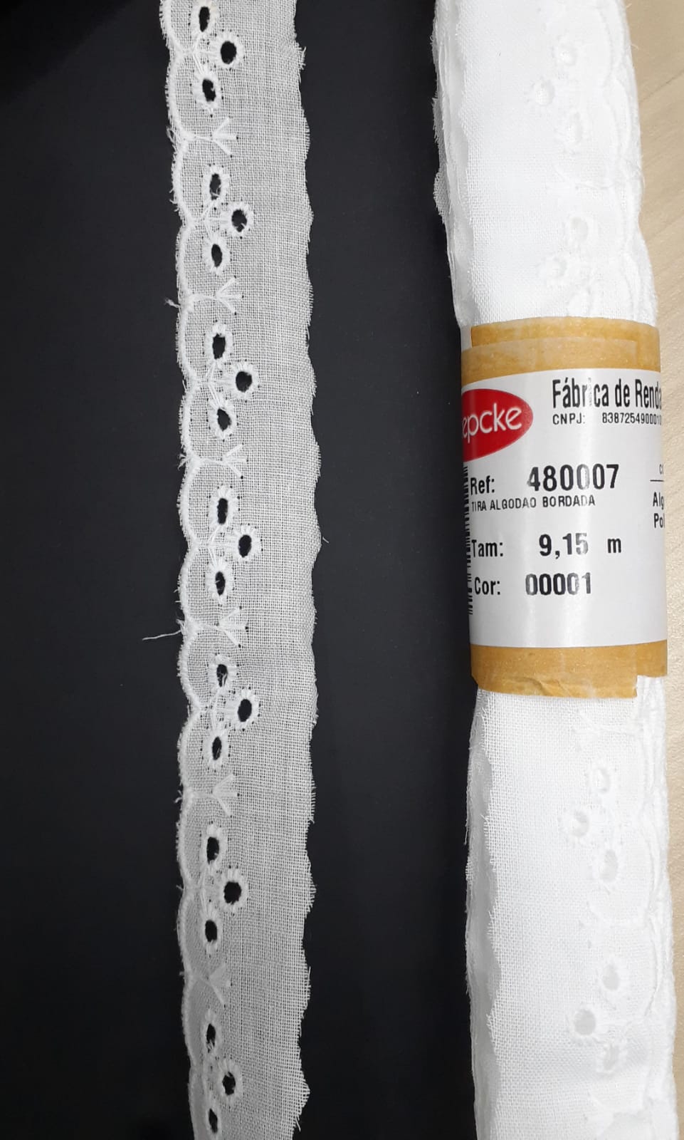 Tira bordada entremeio passa fita, usada no acabamento de peças como roupas, toalhas, colchas e em artesanatos em geral.