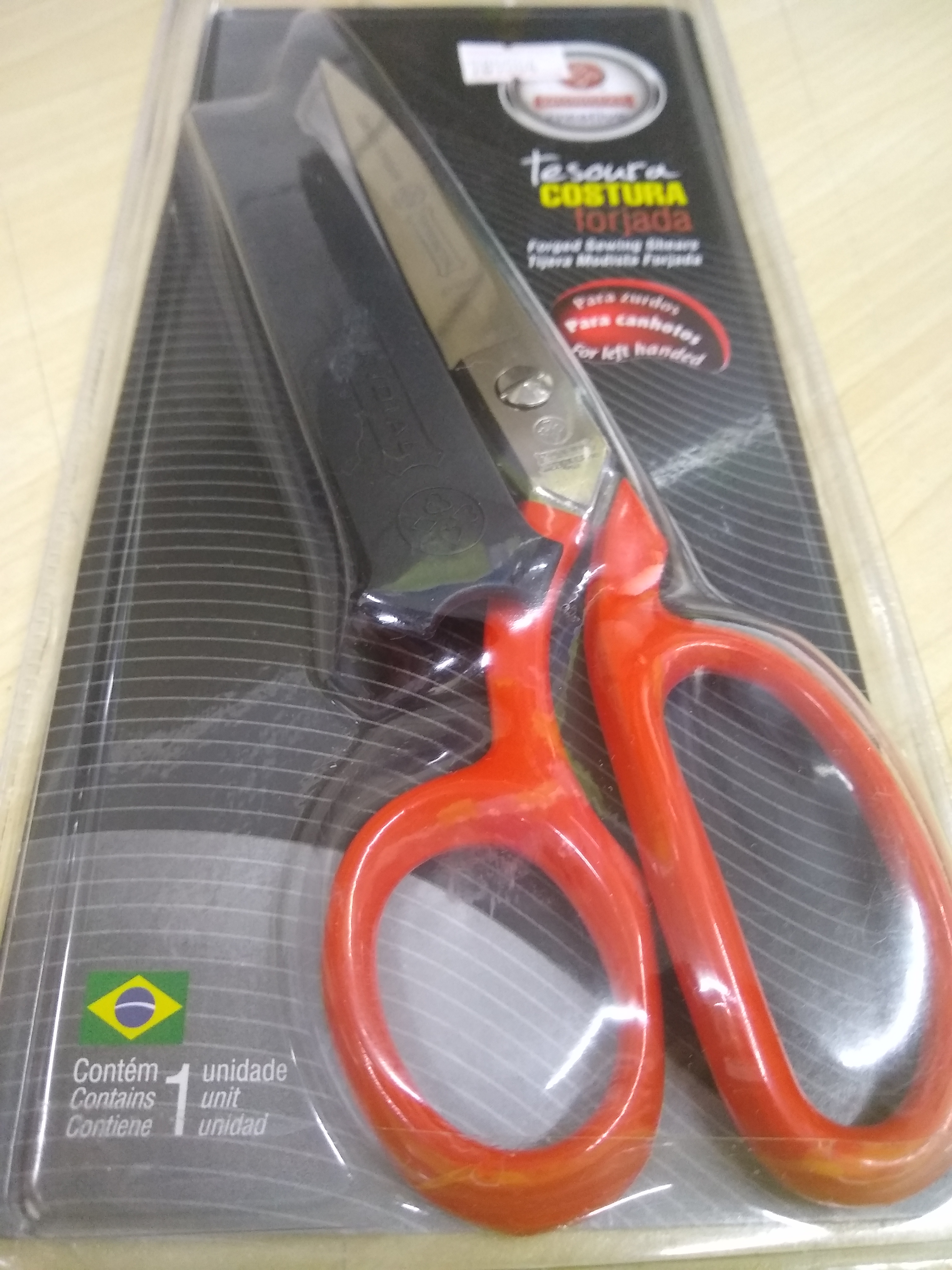 Tesoura para costura profissional, cabo anatômico, esmaltado, com aro alongado. Lâmina Serra Sharp (de um lado fio navalha e de outro lâmina microsserrilhada, que não deixa o tecido fugir), para cortes de precisão em grandes partes de tecido, inclusive os de alta resistência.